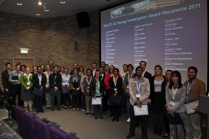 The ET-12 Young Investigator Award was presented to investigators aged 35 and younger in recognition of the excellence of research presented at ET-12. A total number of 35 awards was presented to young investigators from 11 countries. Bambang Widyantoro (far right), after ET-10 and ET-11, was awarded an Young Investigator Award