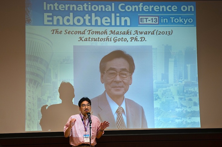 During the 25th anniversary meeting of the International Conferences on Endothelin held in Tokyo, Japan, September 8-11, 2013, Katsutoshi Goto, PhD, was presented The Second Tomoh Masaki Award for his contribution to the work that led to the discovery of endothelins as part of Dr. Masaki's team at the University of Tsukuba. The presentation of the award to Dr. Goto and the work that led to it have been summarized in a recent article published in the Endothelin XIII Proceedings.